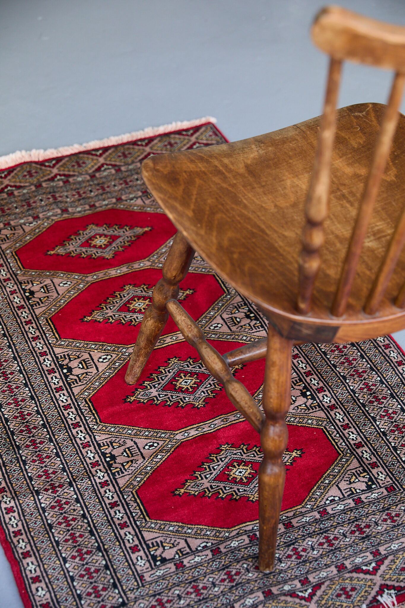 パキスタン産(ラホール地方)、トライバルラグです。手織りされた細かな織り目と、上質なウールラグならではの滑らかさが特徴。レッド、ブラック、ベージュを基調としたデザインが魅力的な一枚です。ペルシャ絨毯やバルーチラグとはまた違う、雰囲気があります。