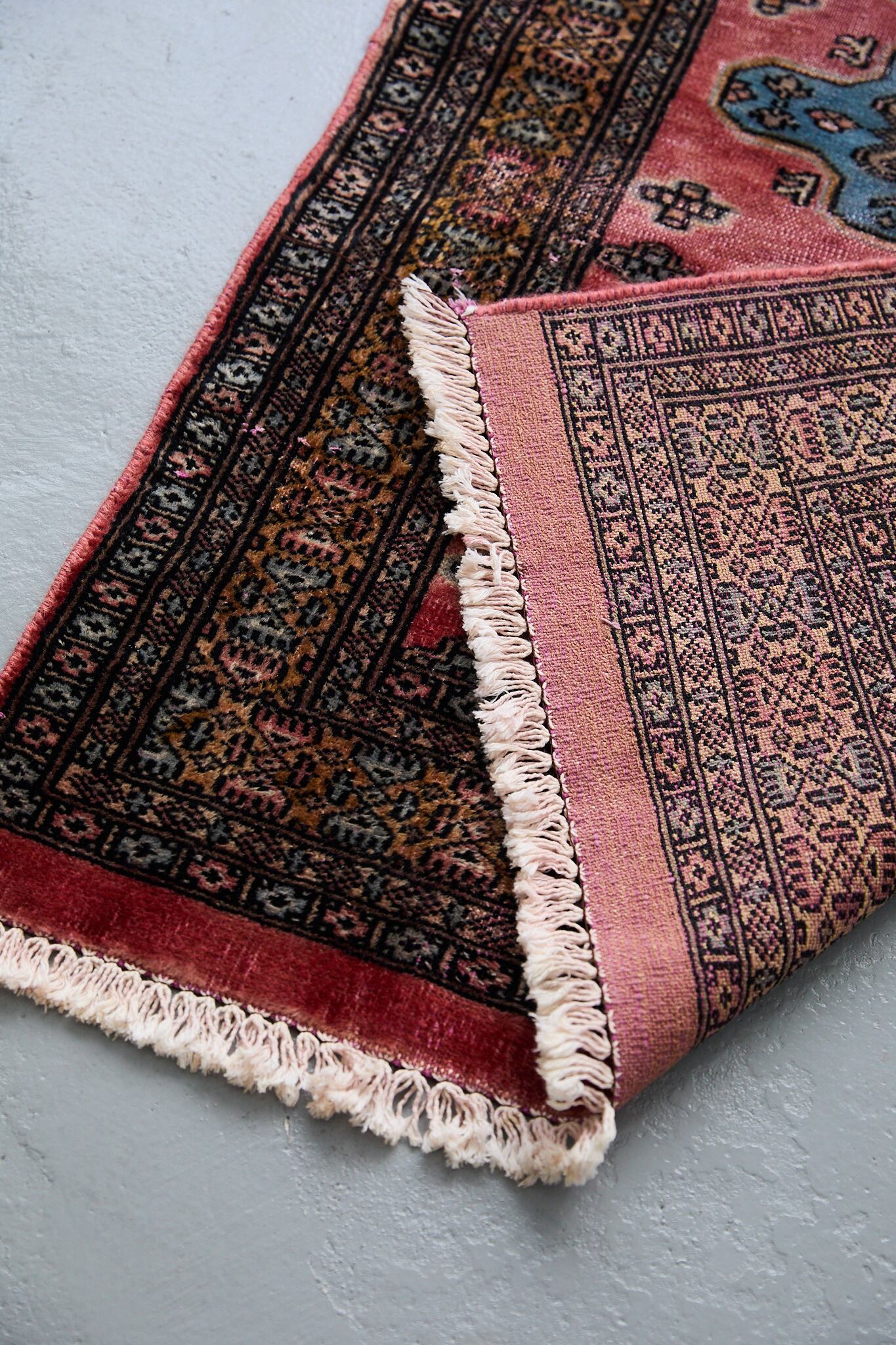 経年25年。パキスタン産(ラホール地方)、トライバルラグです。ブルー・ブラウン・グレー・レッド・ピンクを基調としたデザインが特徴的です。さらさらとした肌触りが心地よい、手織り絨毯です。
