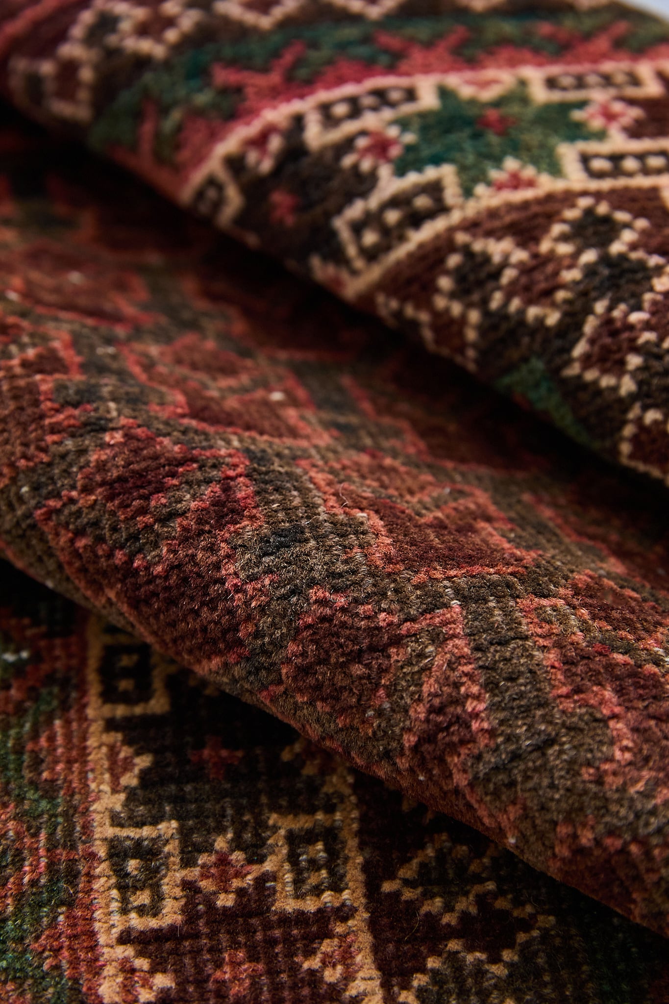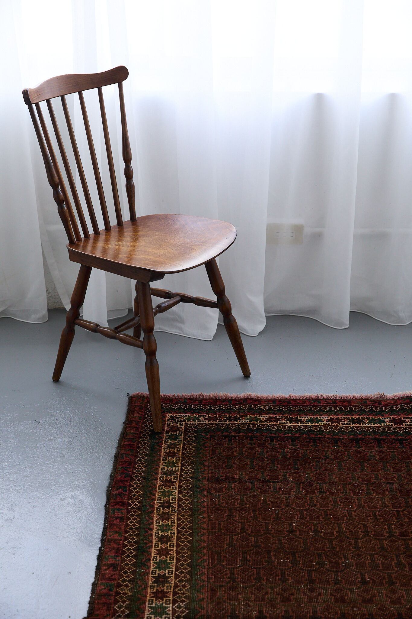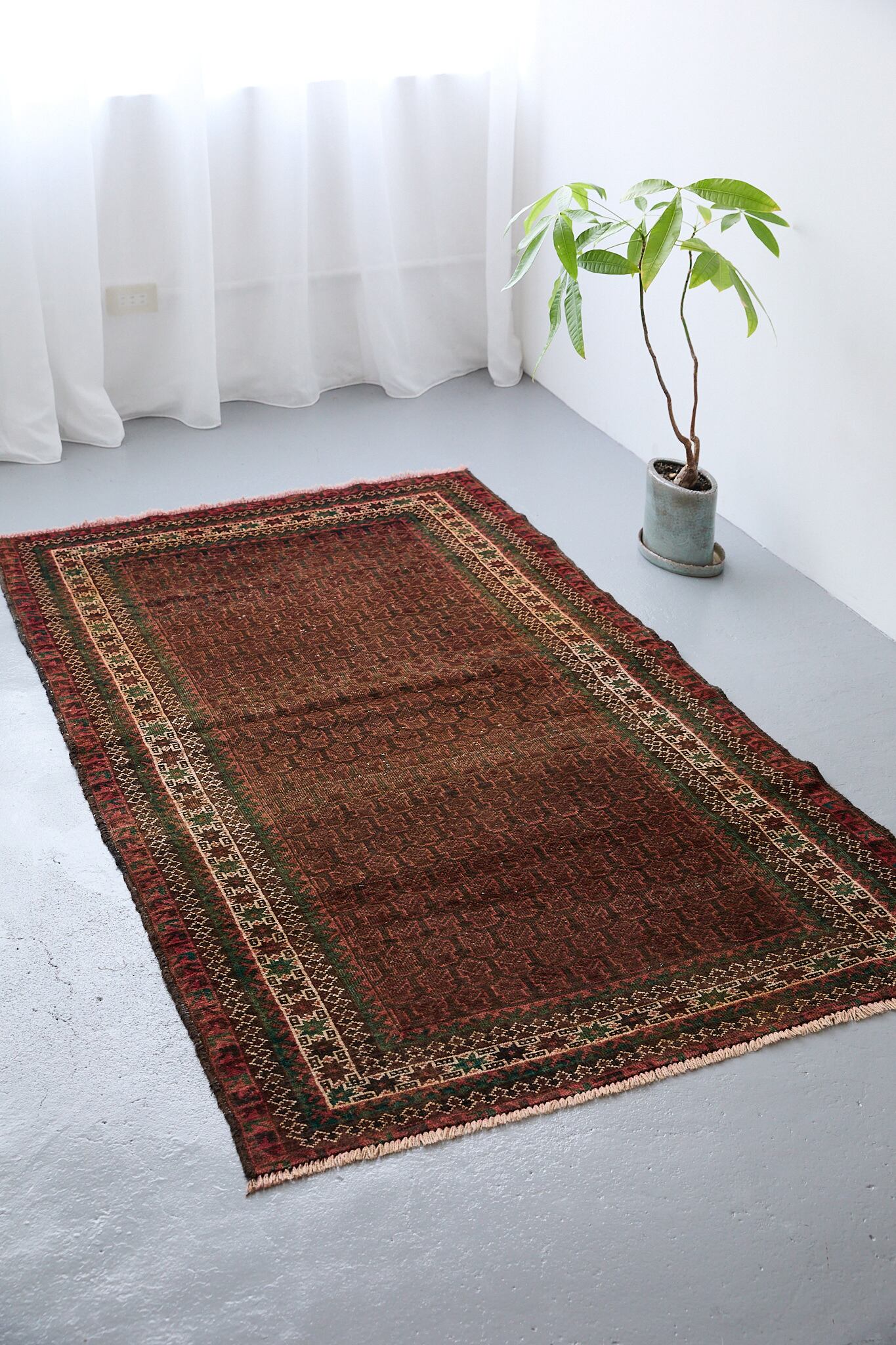 経年40年。アフガニスタン産(アドラスカン産)、バルーチラグです。規則性のある幾何学模様が特徴的で、さらりとした上品な光沢は、空間に洗練された気品をもたらします。