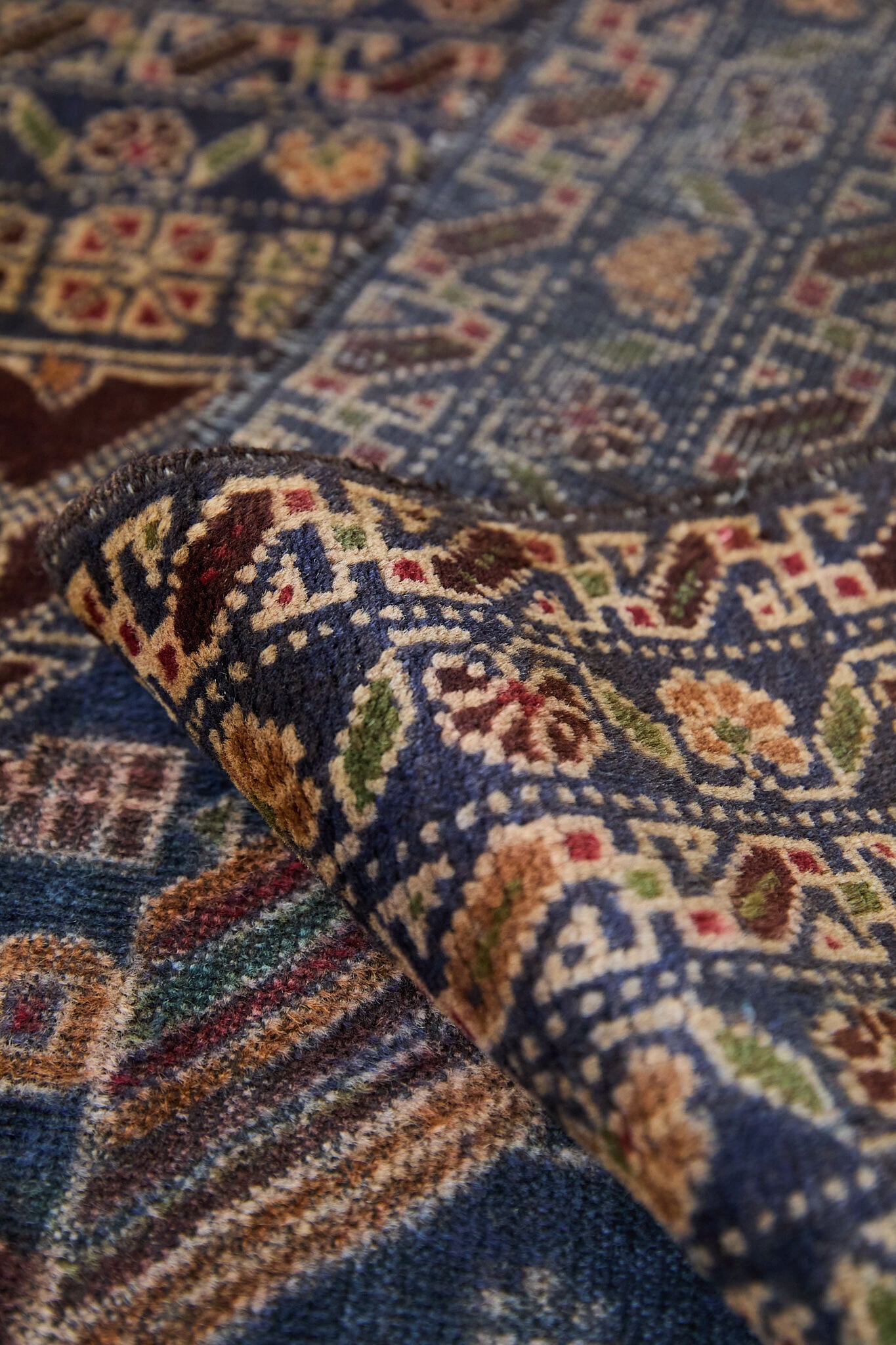 中央右側に下糸の露出や経年の擦れがありますが、密に織られた丈夫な手仕事の一枚です。さらりとした毛並みに、色使い豊かな草花模様がフィールド一面に広がる、美しいヴィンテージラグです。