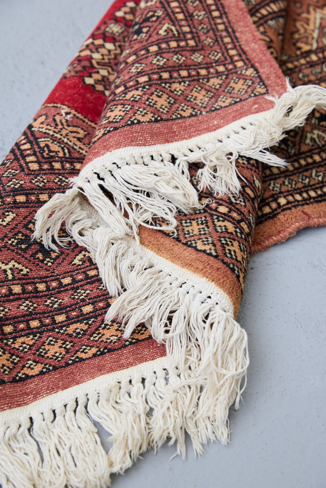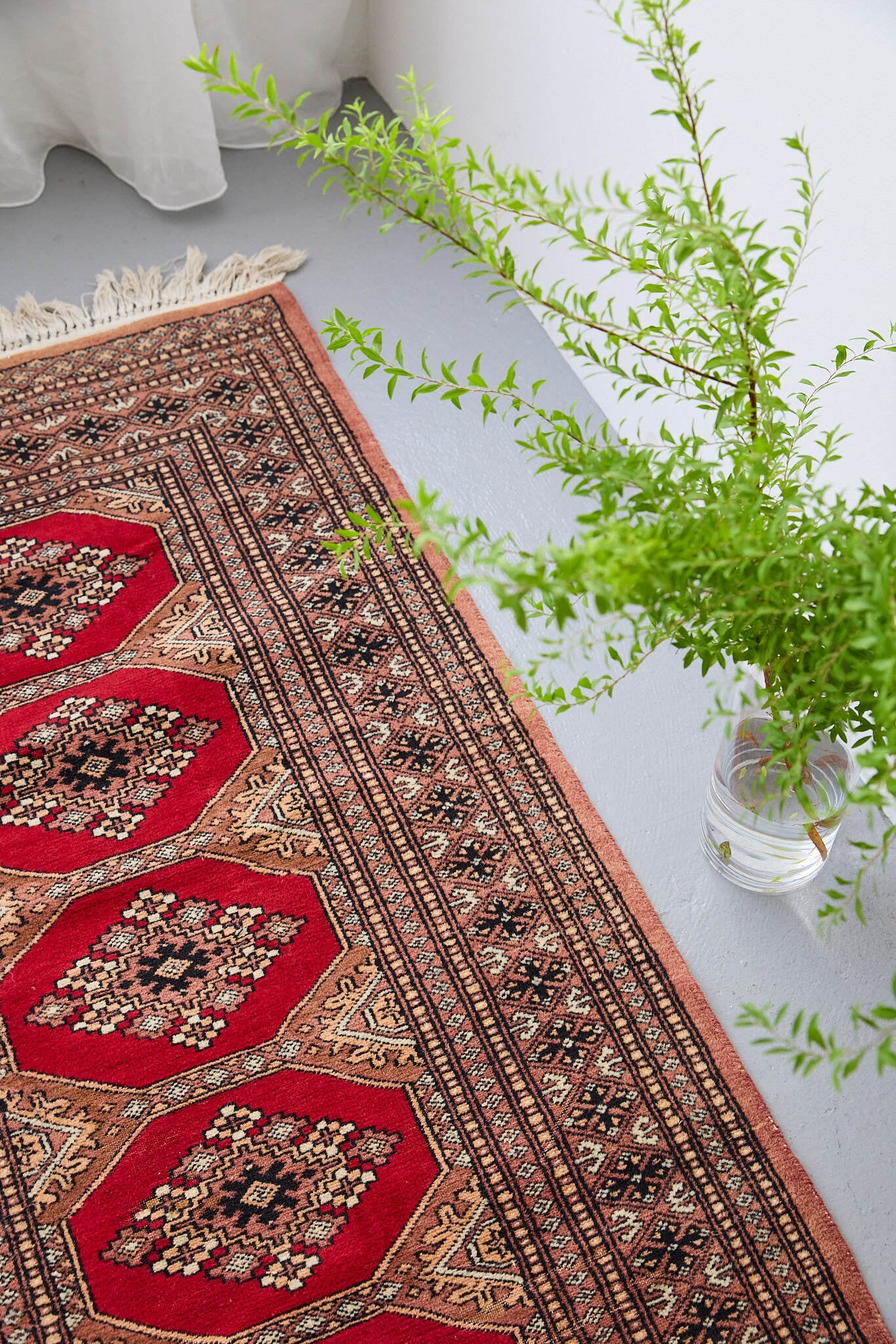 細長い形状が特徴的な手織りのランナーラグです。赤を基調としたクラシカルな幾何学模様が美しく、廊下やベッドサイドなど細長いスペースにぴったりのサイズ感。伝統的なブハラデザインが空間に上品さと温もりを添えてくれます。