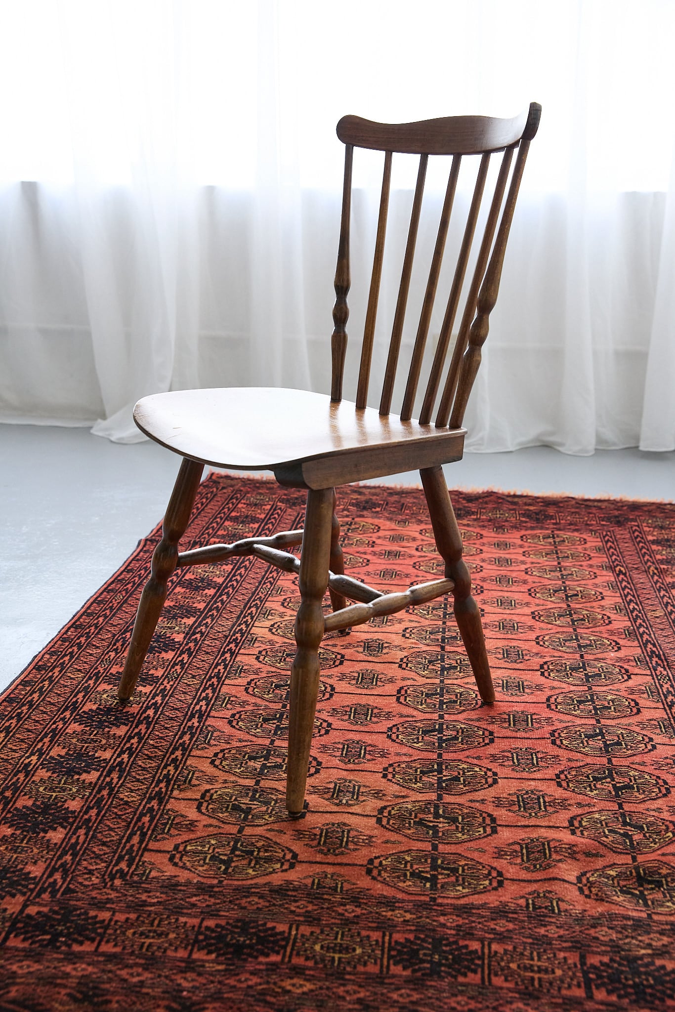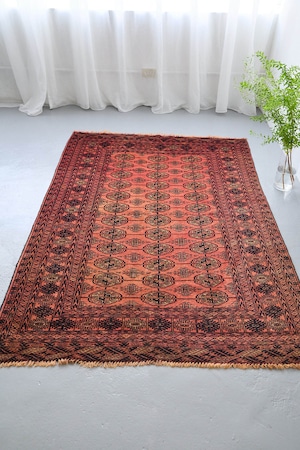中央アジア・トルクメン族テケ部族によって織り上げられた、伝統的なギュル文様が美しいヴィンテージラグ。赤を基調とした力強い色彩に、細やかな幾何学模様が縁を彩り、クラシックでありながらどこかモダンな印象を与えてくれます。