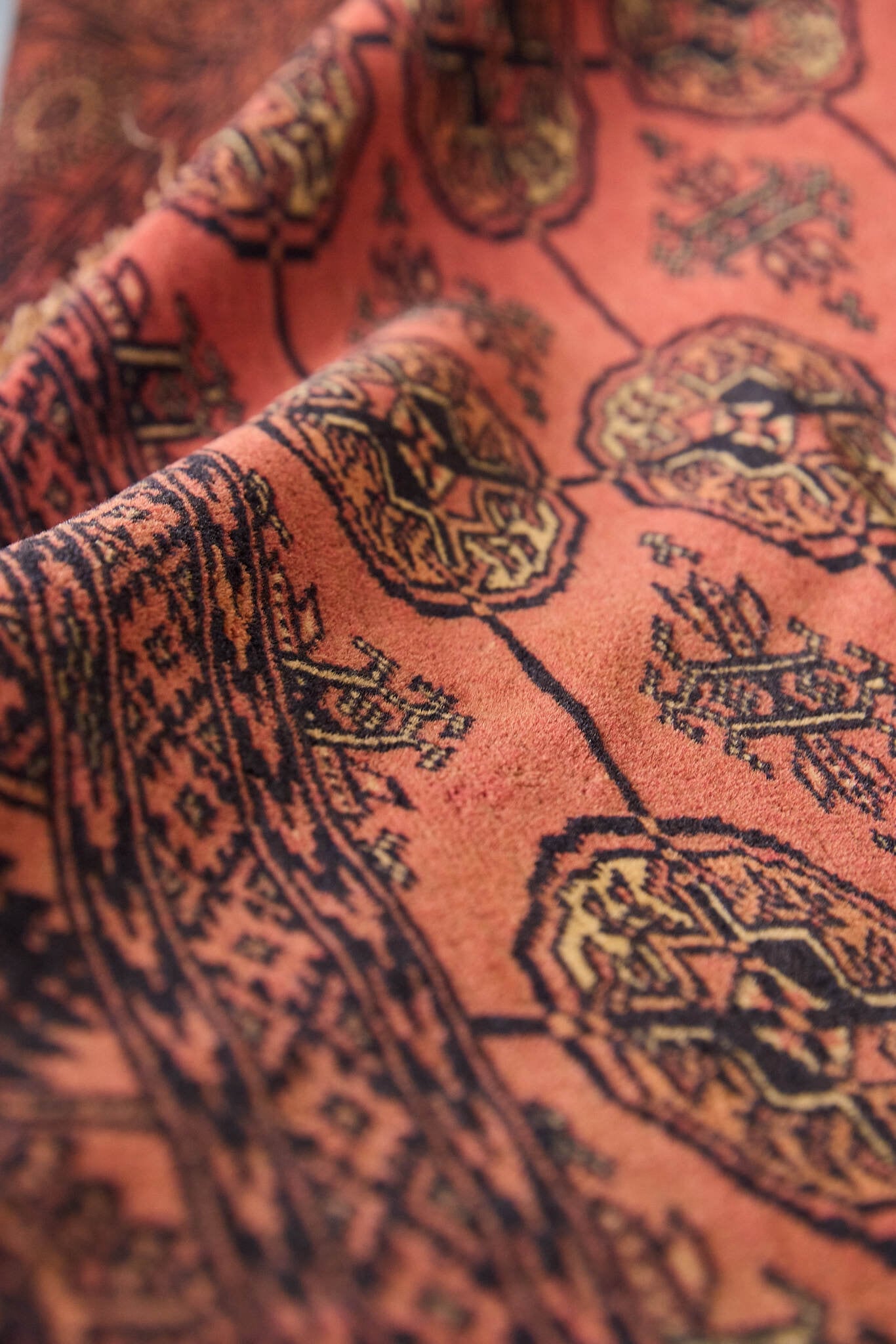 長い年月を経て赤から柔らかな朱色へと変化した表情は、ヴィンテージラグならではの魅力です。