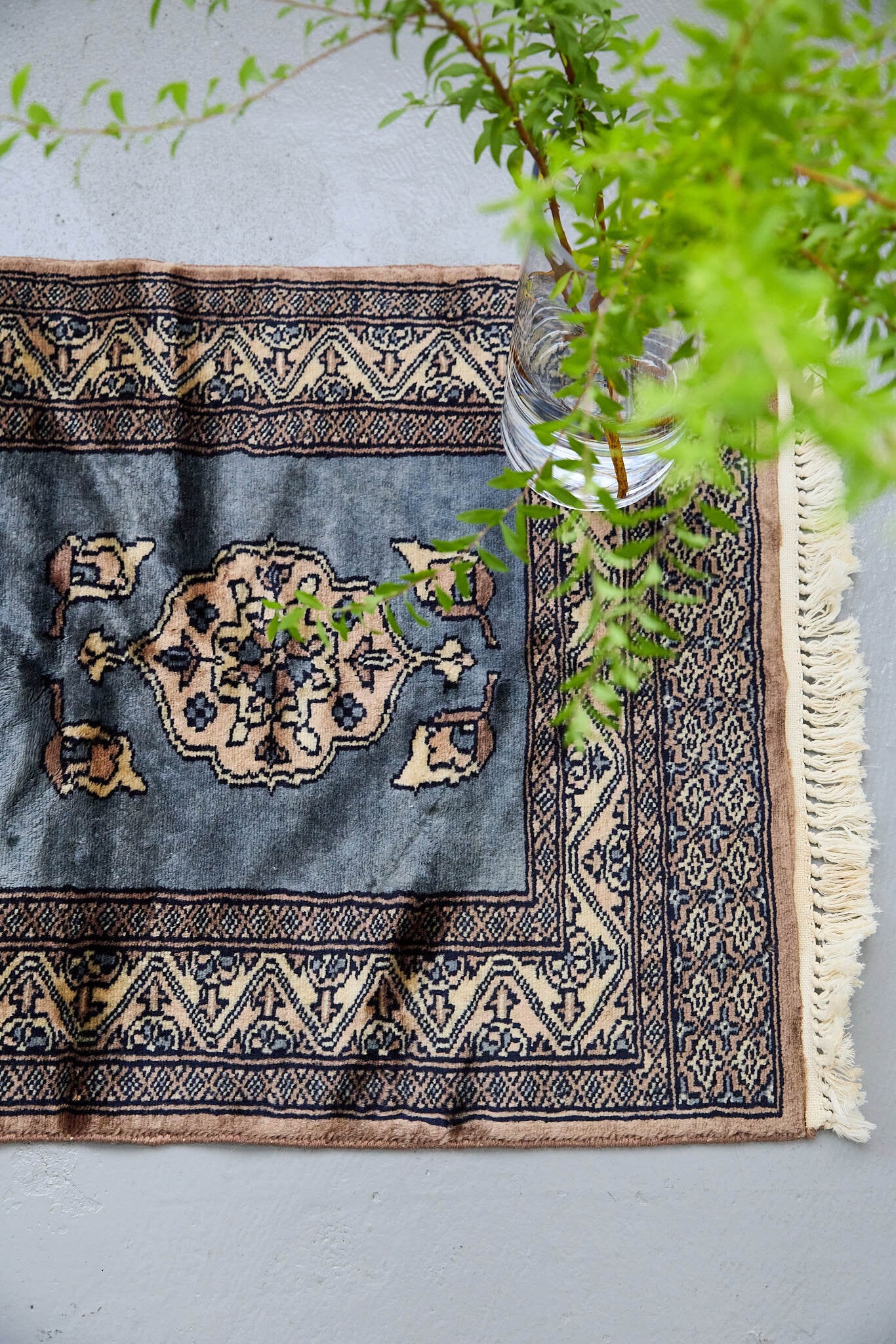パキスタン・ラホール産のトライバルラグです。艶やかなウールに幾何学模様が美しく映え、経年30年ならではの上質な織りが魅力。珍しいブルーグレーの地に、クラシカルなメダリオン文様と緻密なボーダー柄が施されています。アンティーク家具や和洋空間にもよく合います。