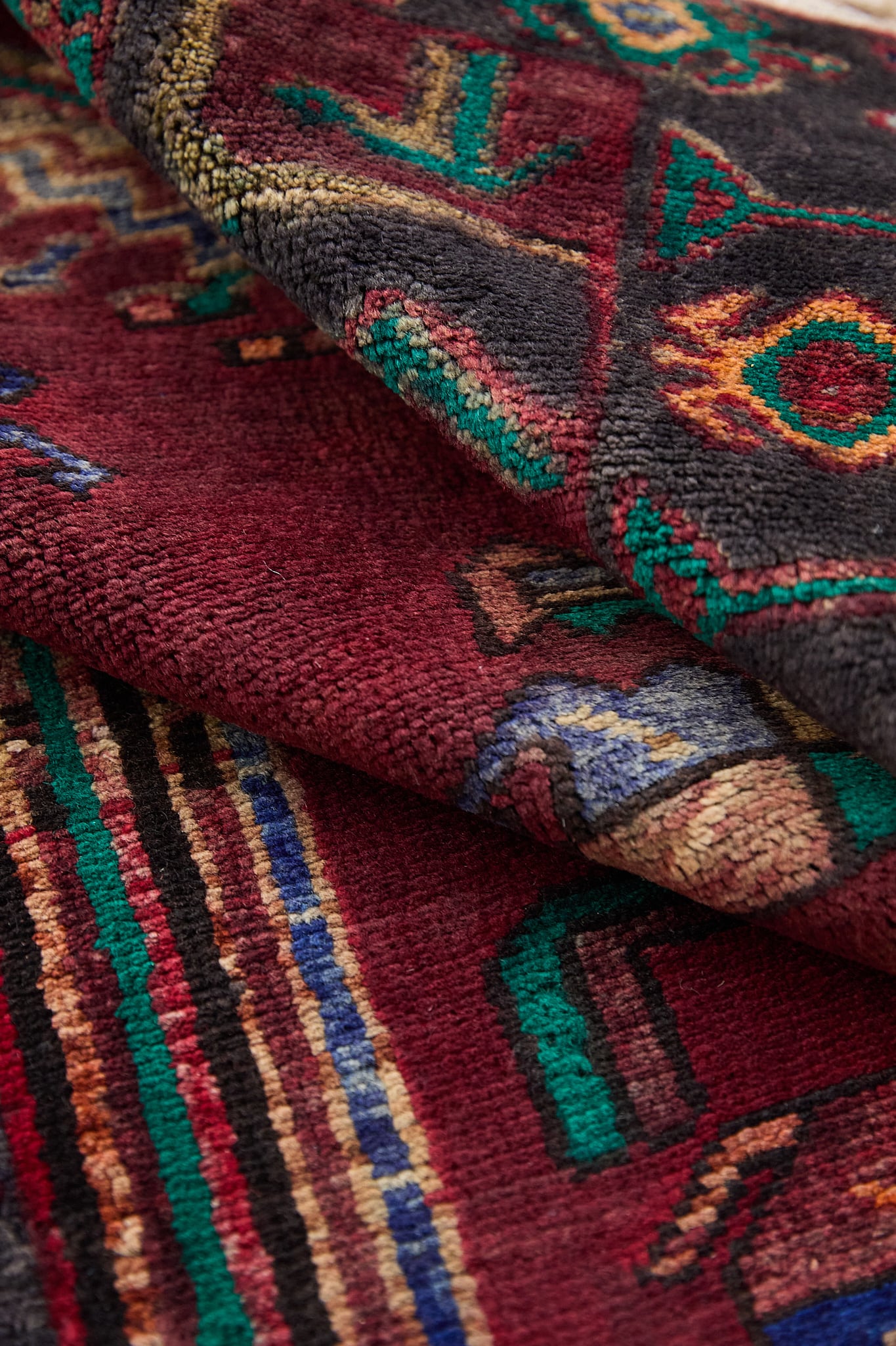 経年45年。最下部左側に経年による下糸の露出や色滲みが見られます。全体には美しい擦れが広がり、パイルは経年で程よく落ち着き、ヴィンテージらしい表情をまとっています。