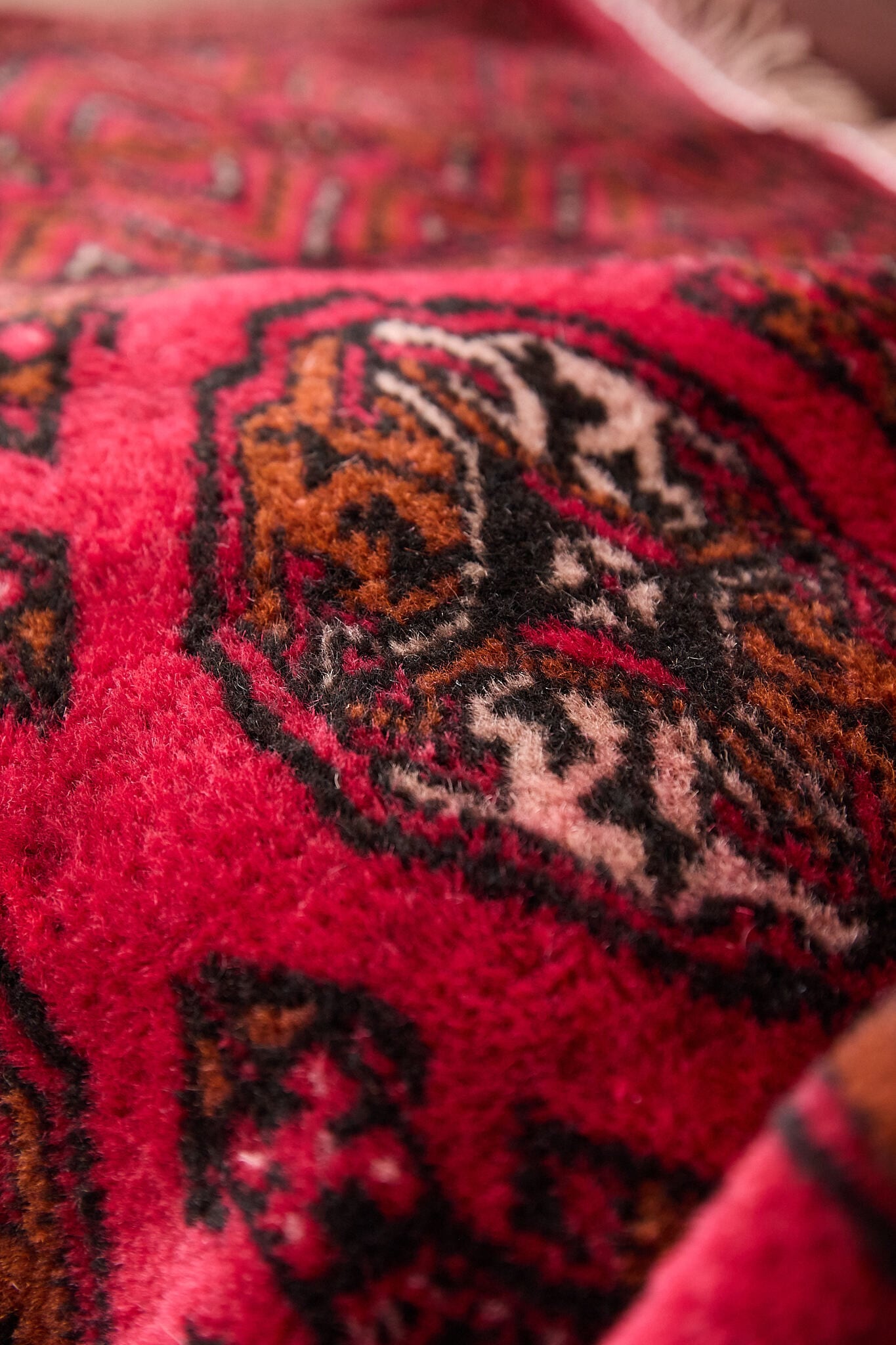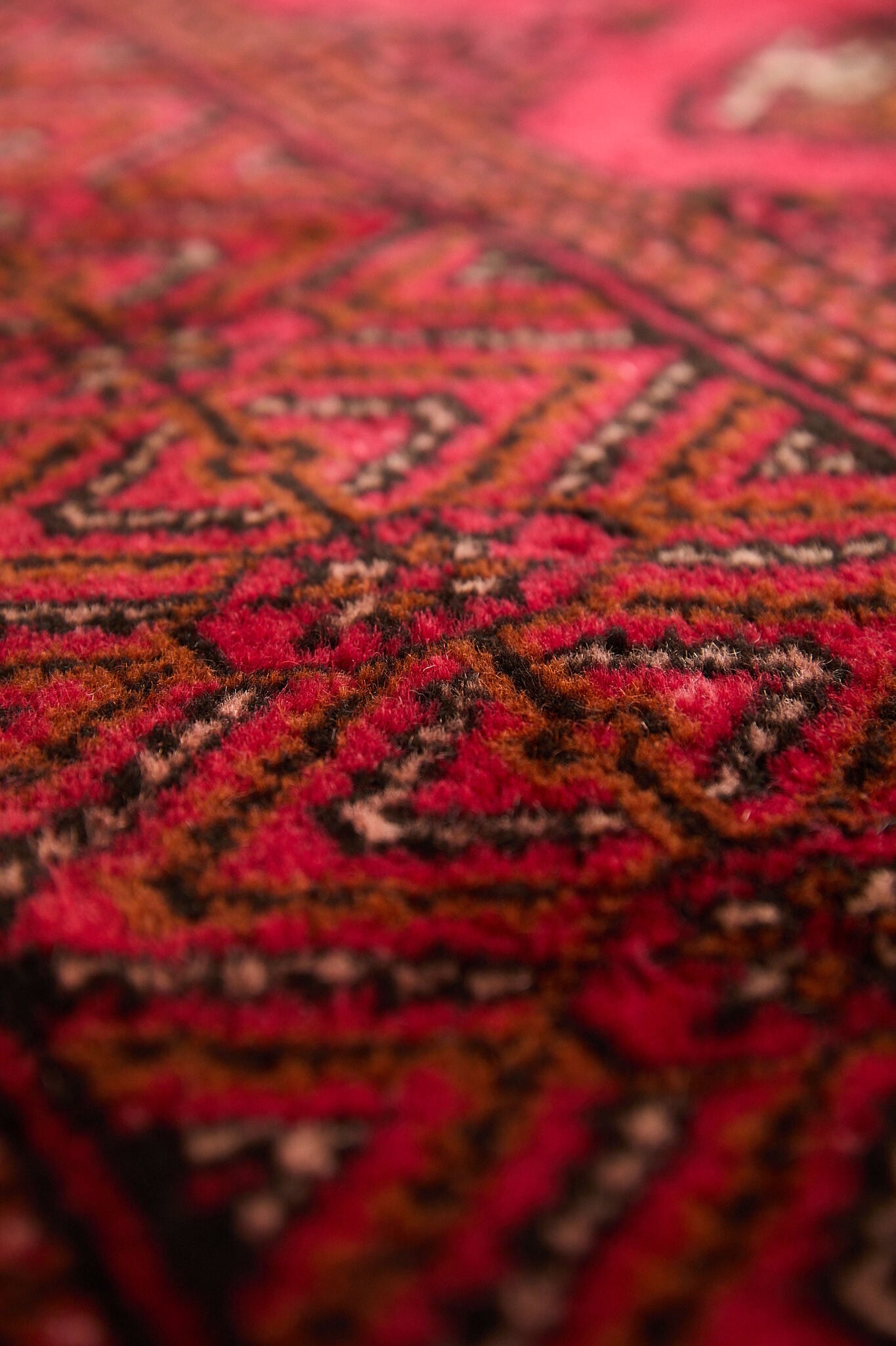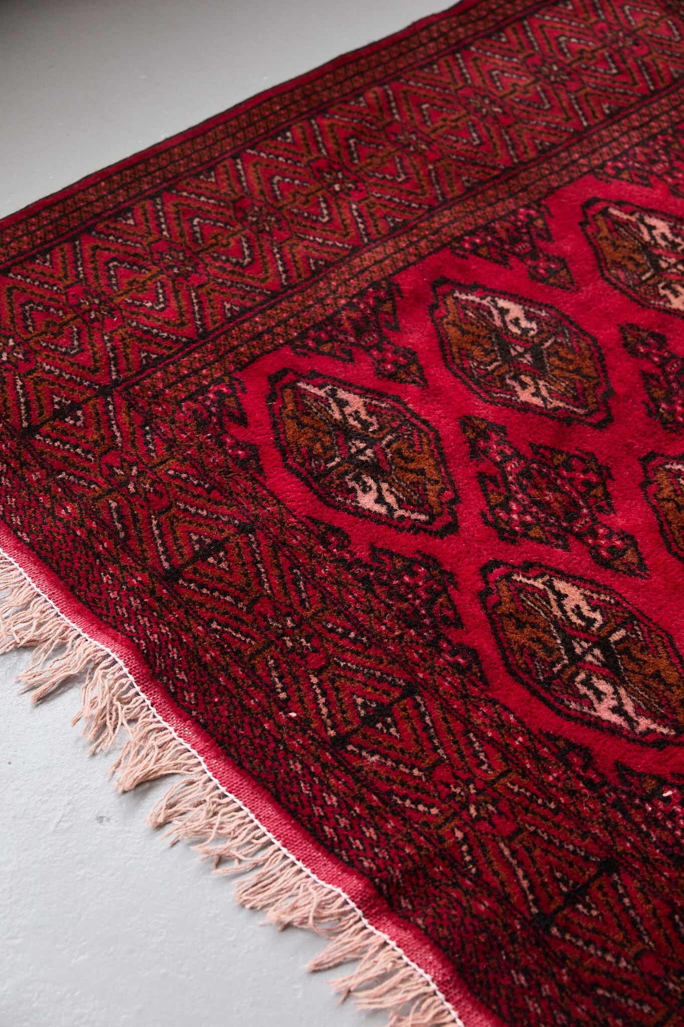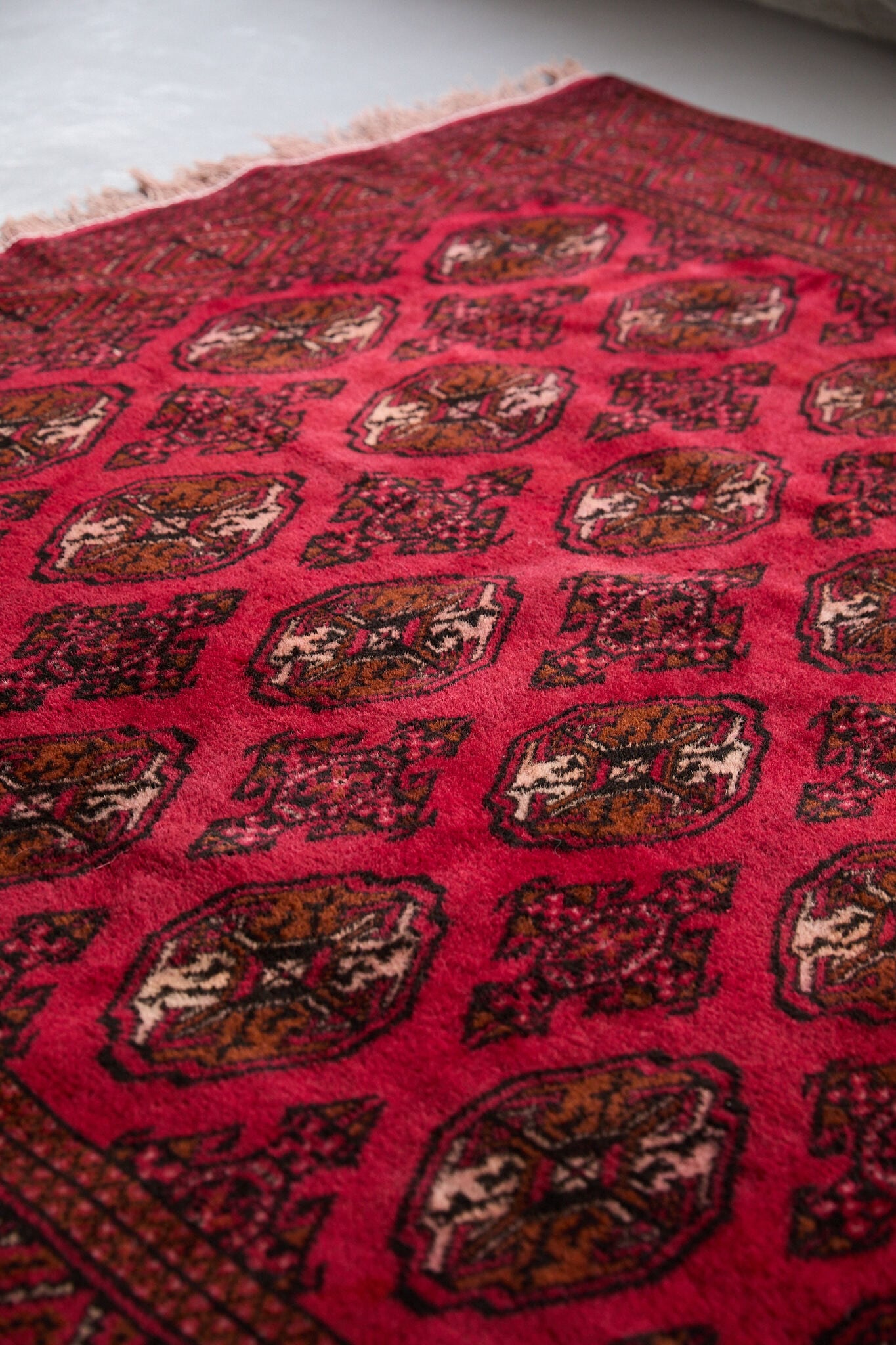 パキスタン・ラホール産、経年約40年のヴィンテージラグ。深みのある赤と細かなブハラ文様が美しい大型サイズの一枚です。柔らかな質感と落ち着いた存在感が空間を上品にまとめてくれます。