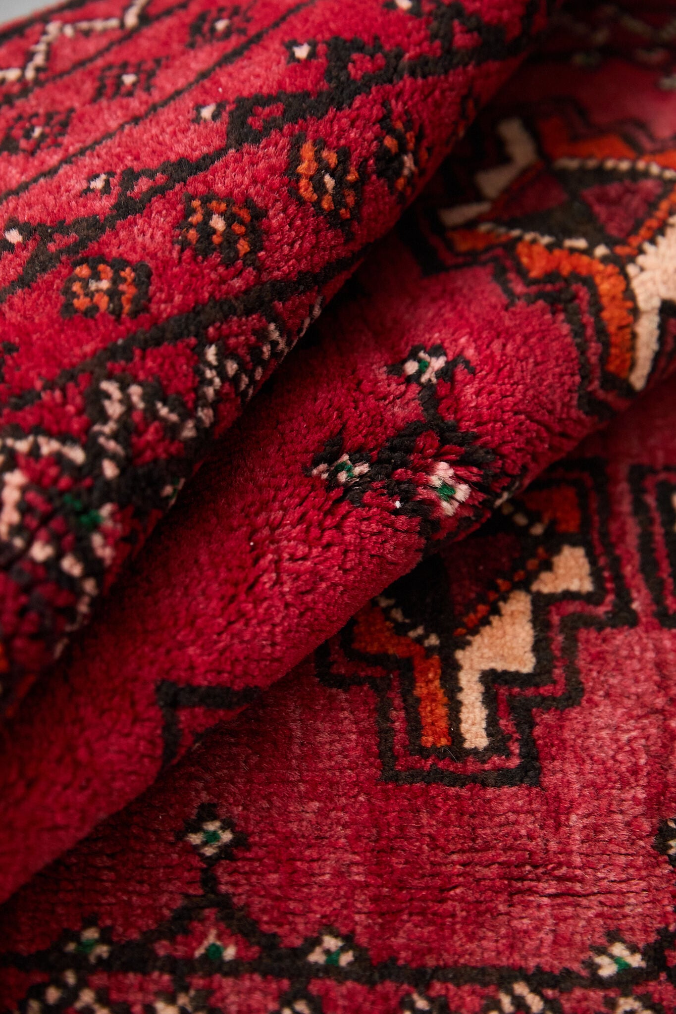 深みのあるレッドを基調に、アフガンラグらしい幾何学文様が整然と並ぶヴィンテージラグ。