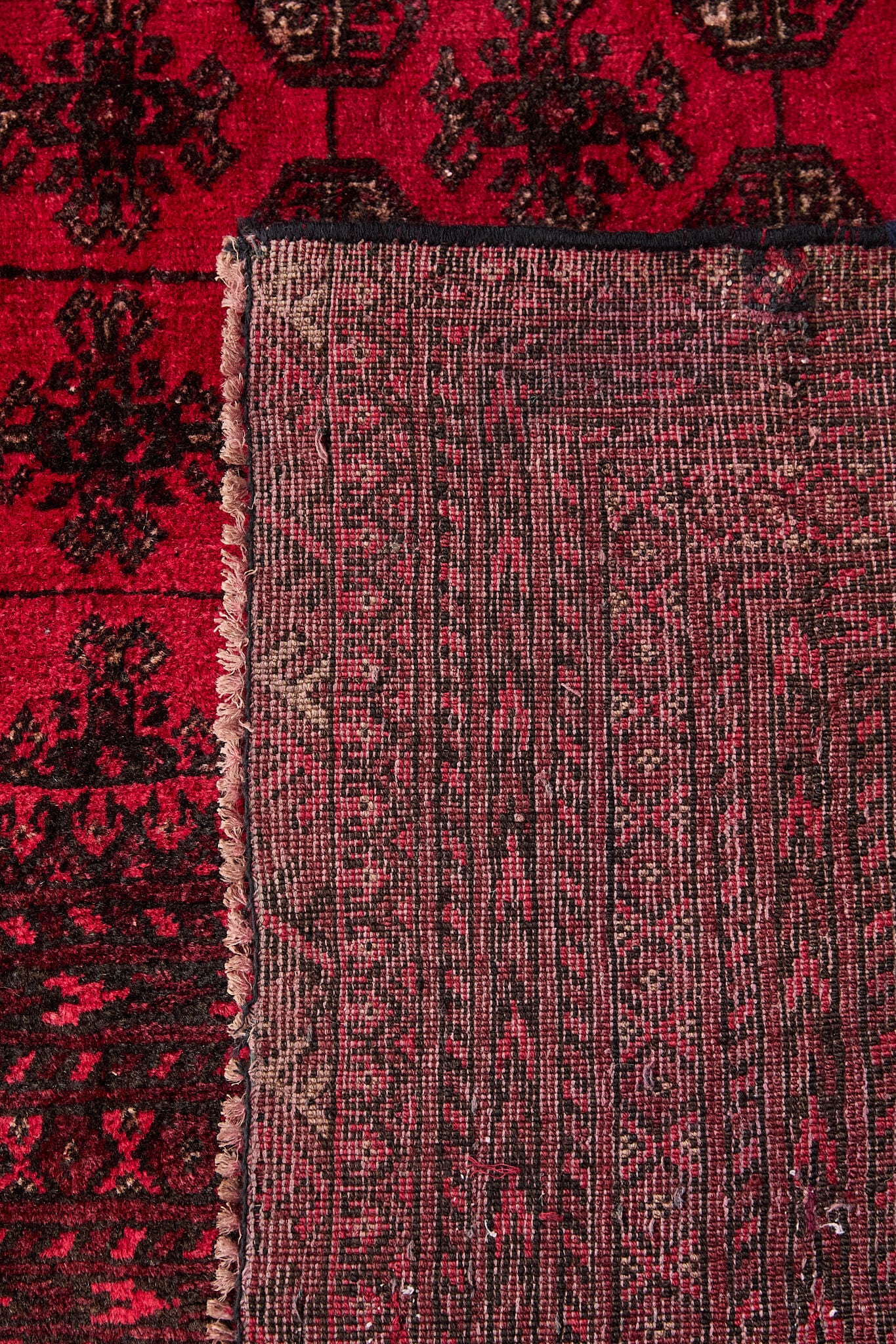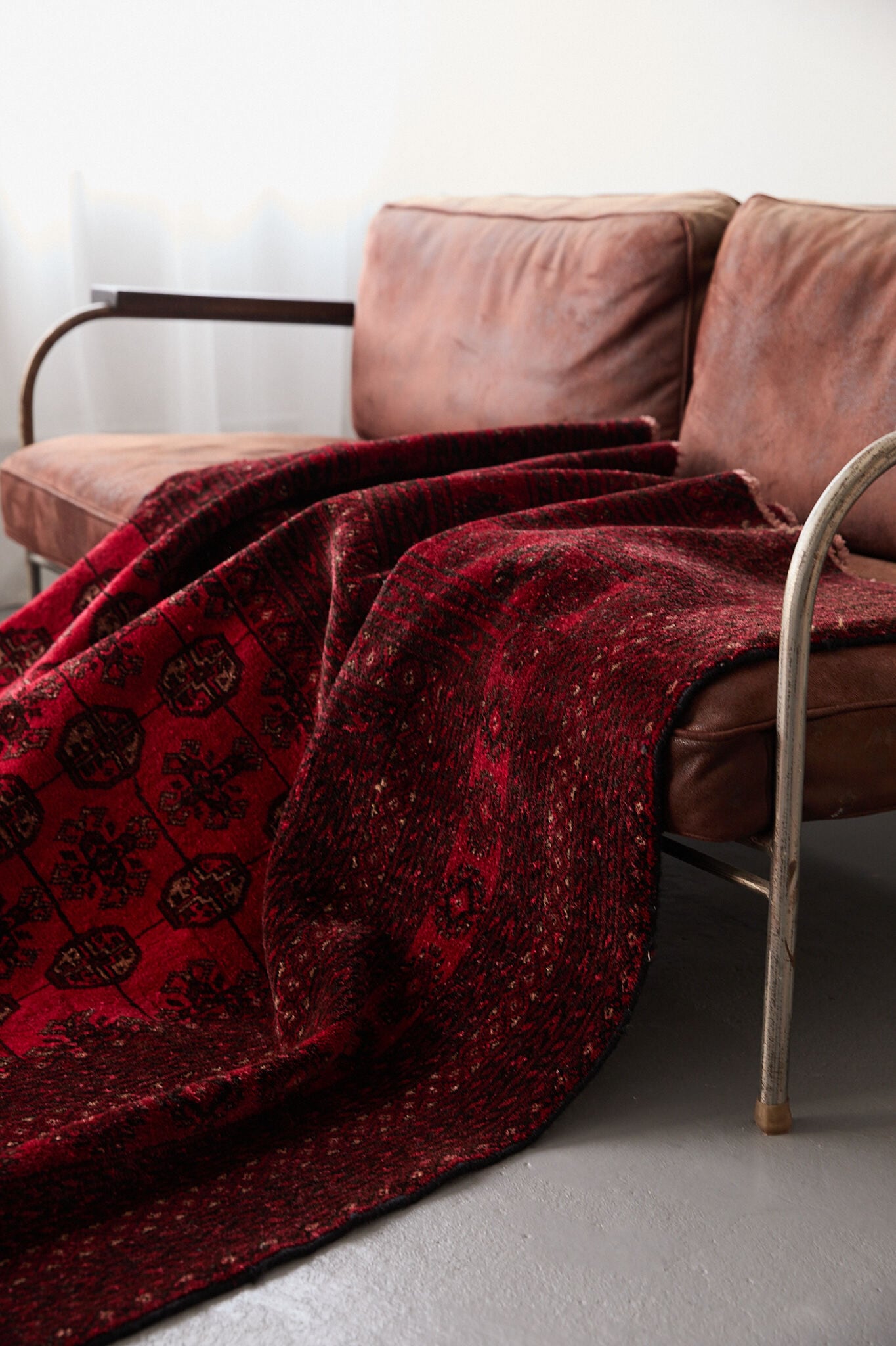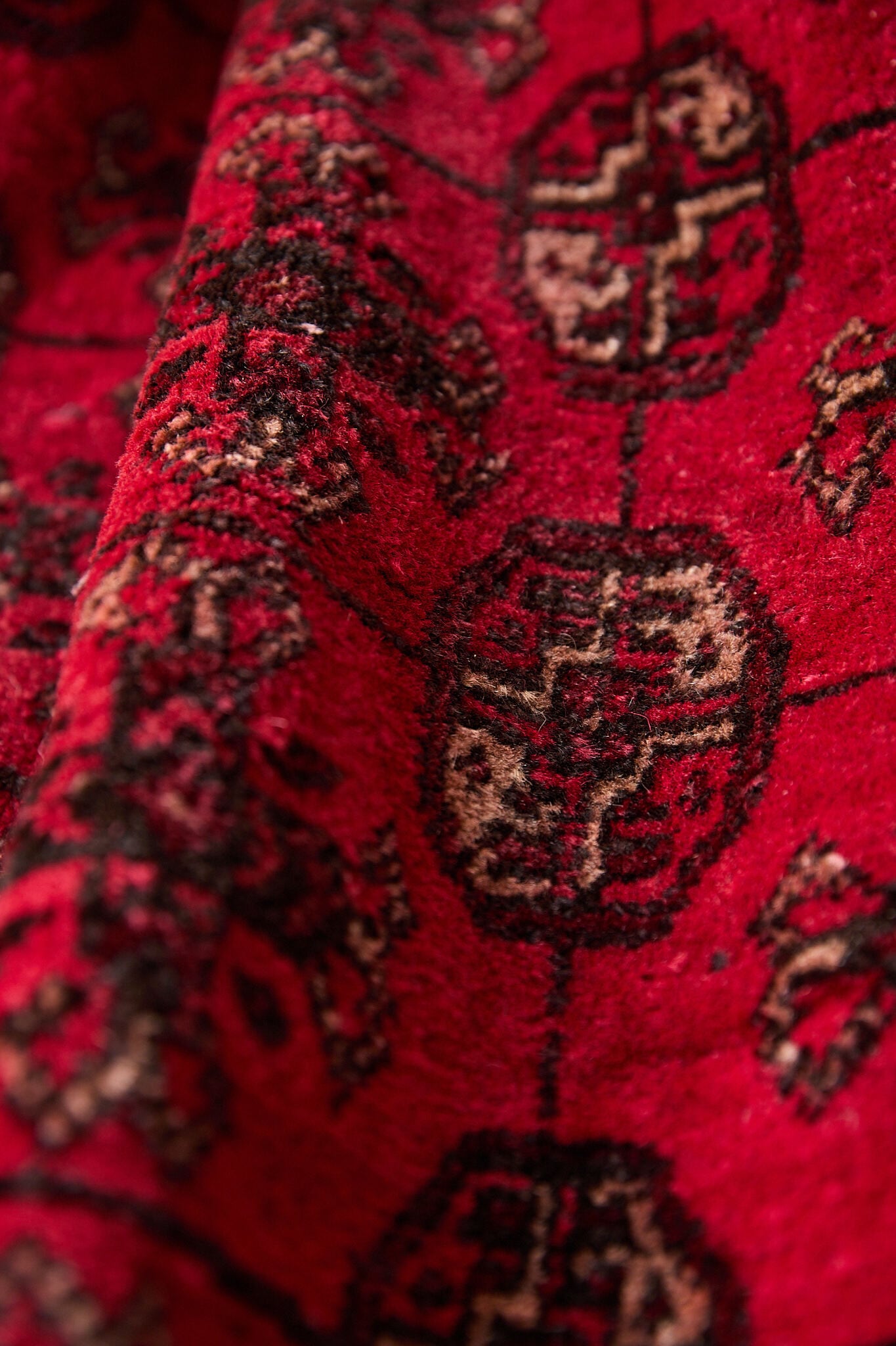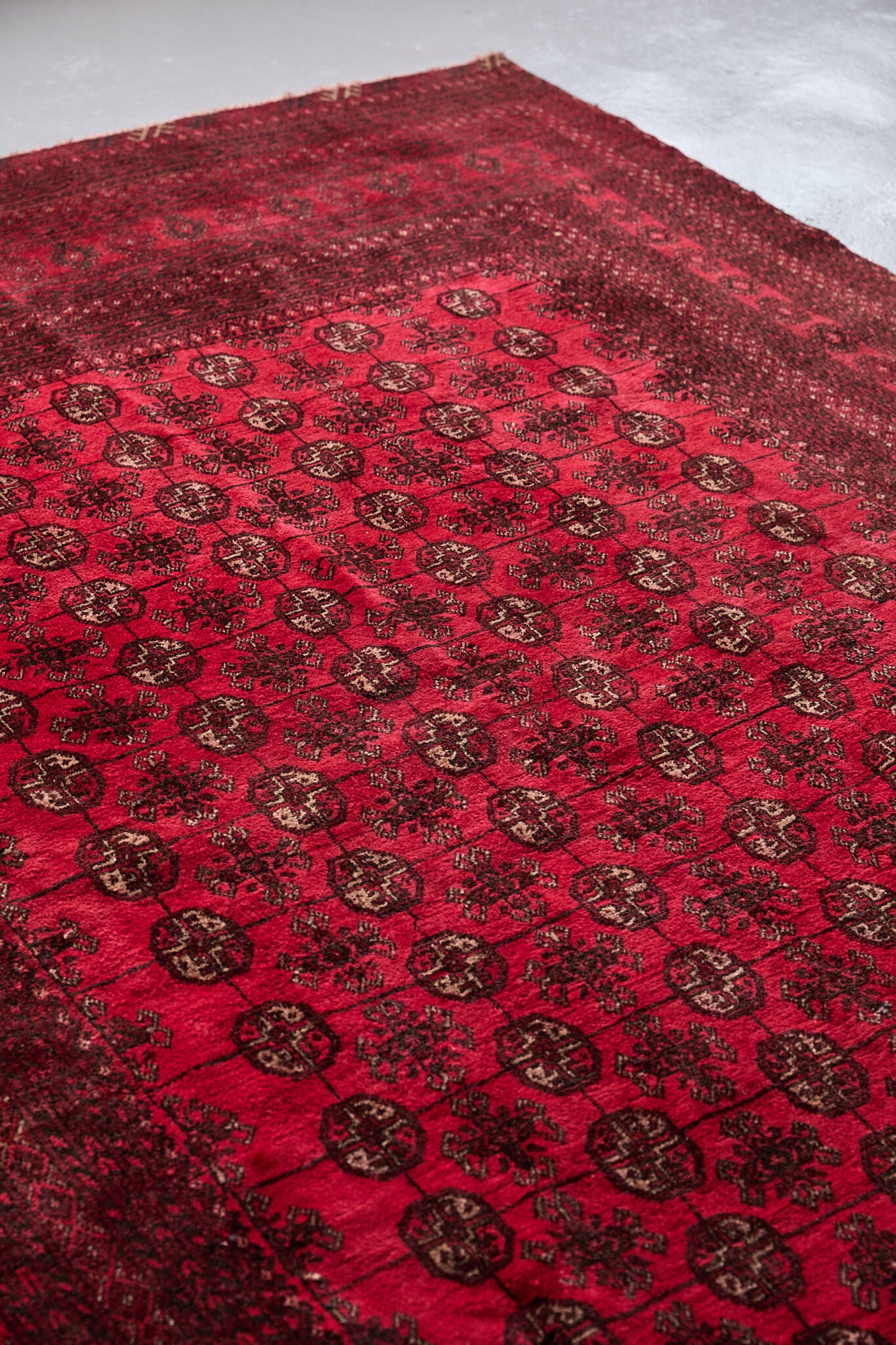 深いレッドに細かなギュル文様が並ぶ伝統デザインで、敷くだけで空間に重厚感と上品さを添えてくれます。経年で落ち着いた風合いに育ったウールはしっとり馴染み、厚さ約8mmのしっかりとした厚みで踏み心地も良好。リビングや店舗にも映える存在感のある一枚です。