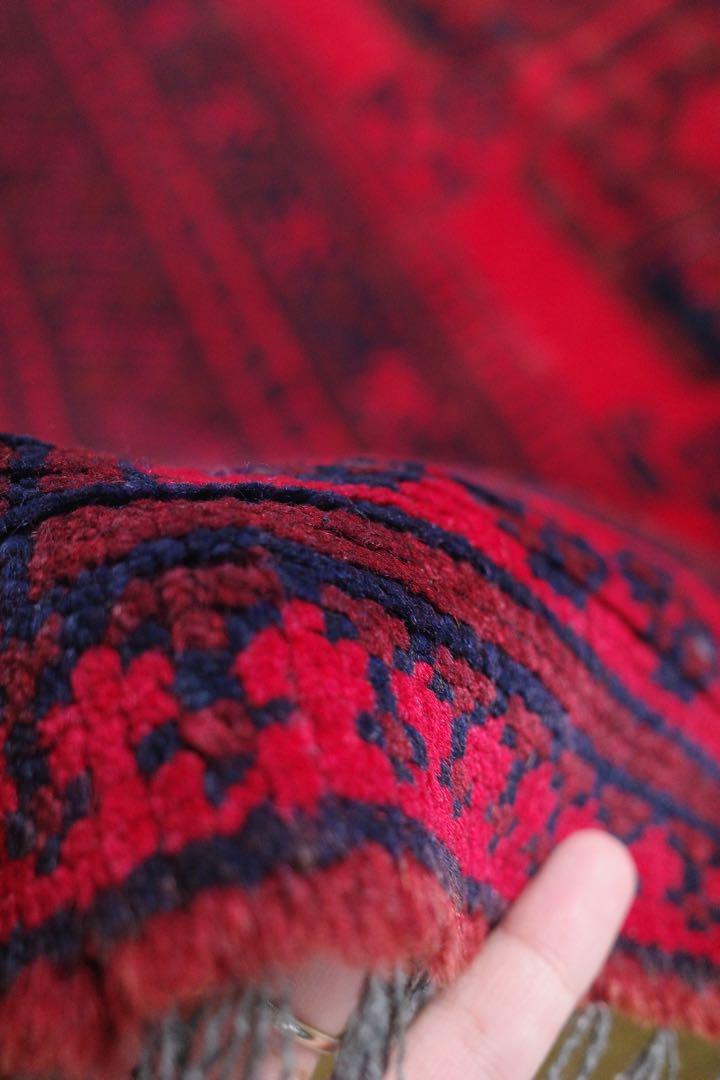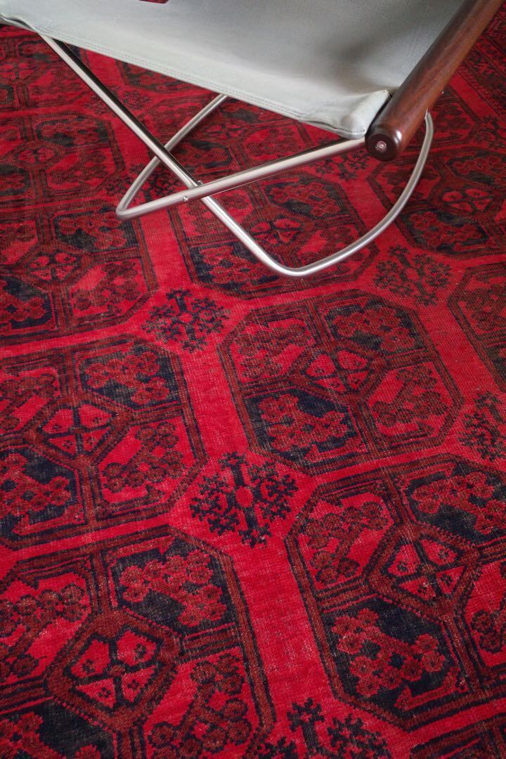 アフガニスタン産高品質ウール100%。全体的に経年による美しい擦れ、色滲みが広がっております。肉厚でサラサラとした手触りはとても心地よく、柔らかな触り心地です。ペルシャ絨毯やバルーチラグとはまた違う、アフガンラグ独特な雰囲気を持っています。